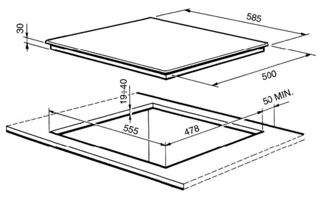 Отверстие в нише выполняют, исходя из размеров самой варочной панели — они должны соответствовать друг другу либо немного превышать размеры выреза. При выборе наиболее распространенной варочной панели с 4 конфорками в столешнице вырезается отверстие шириной 59 см и глубиной около 49-50 см. Толщина столешницы должна быть немного меньше, чем высота варочной панели, в противном случае панель придется заглубить, чтобы она не слишком выступала.
