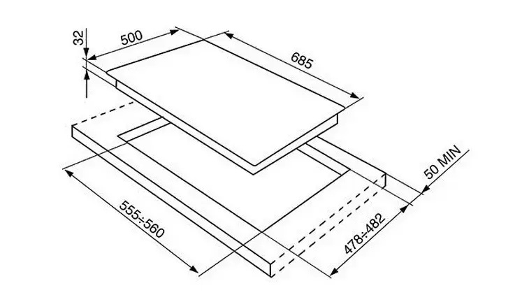 Отверстие в нише выполняют, исходя из размеров самой варочной панели — они должны соответствовать друг другу либо немного превышать размеры выреза. При выборе наиболее распространенной варочной панели с 4 конфорками в столешнице вырезается отверстие шириной 59 см и глубиной около 49-50 см. Толщина столешницы должна быть немного меньше, чем высота варочной панели, в противном случае панель придется заглубить, чтобы она не слишком выступала.