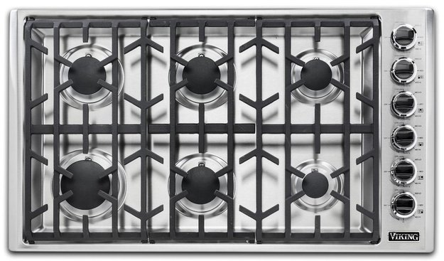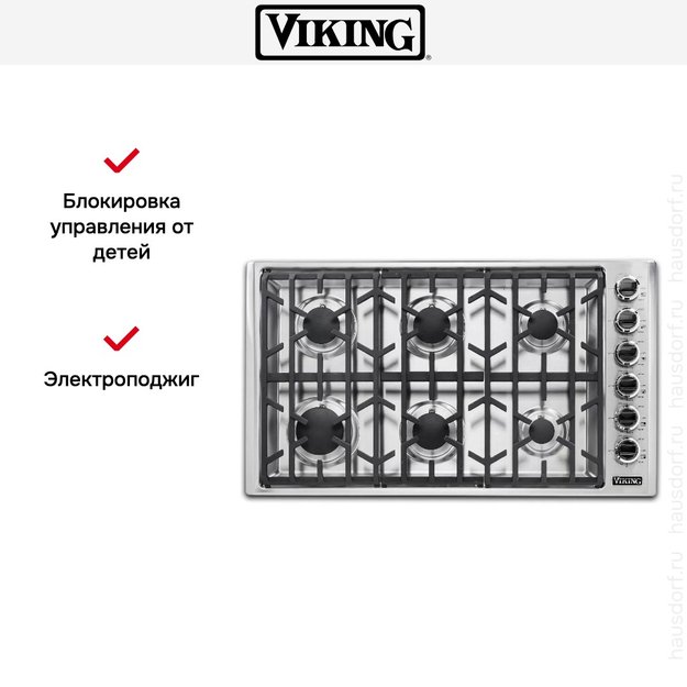 Варочная панель Viking предназначена для работы на природном газе; чтобы подключить ее к пропану, необходимо дополнительно приобрести переходник. Шесть конфорок разного размера и разной мощности управляются поворотными металлическими ручками. Маркировка уровней пламени на панели управления выполнена лазерной гравировкой, поэтому не сотрется со временем. Поворачивая ручки, можно выбрать одну из пяти фиксированных ступеней мощности, а также выставить значение в нефиксированной зоне Simmer.