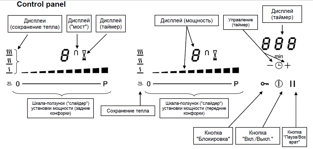 Элементы управления варочной панелью позволяют включать и выключать прибор, регулировать интенсивность нагрева, активировать дополнительные функции — временно увеличивать мощность, подключать контуры расширения конфорок, объединять зоны нагрева, задействовать защиту от детей, экстренно выключать все конфорки сразу и многое другое.