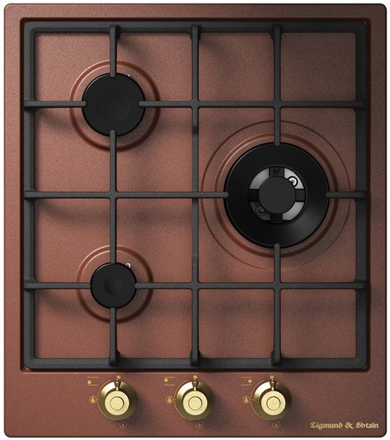 Zigmund Shtain GN 218.451 M — трехконфорочная варочная панель медного цвета. Латунная фурнитура и посудная решетка из чугуна подчеркивают элегантный образ модели. Газ-контроль и электроподжиг гарантируют безопасную эксплуатацию устройства.