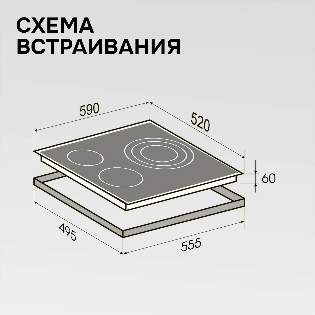 Стандартная ширина устройства составляет около 59–60 см: таковы наиболее востребованные четырехконфорочные модели. Подобный размер облегчает встраивание варочной панели в стандартную кухонную столешницу.