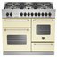 Bertazzoni MAS100 6 MFE T CR T — варочный центр в элегантном кремовом корпусе, дополненном изящной хромированной фурнитурой. Модель характеризуется отдельностоящим типом размещения и комплектуется набором эмалированных противней. Для приготовления пищи доступны три электрических духовки и шесть газовых конфорок, различного уровня мощности.