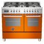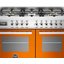 Bertazzoni PRO1006MFEDART— отдельно стоящий варочный центр шириной 100 см, выполненный в ярких оранжевых тонах с отделкой и фурнитурой цвета нержавеющей стали. Модель включает в себя газовую варочную панель с 6 зонами нагрева, поверхностью из нержавеющей стали и чугунной решеткой, а также два электрических духовых шкафа объемом 69 и 54 литра. Варочная панель оснащена WOK-конфоркой с 2 рядами пламени. Основная электрическая духовка имеет 4 уровня приготовления и 11 режимов работы. На фронтальной панели управления находятся поворотные переключатели для регулировки мощности пламени и задания настроек духовки, а также дисплей, отображающий выбранные функции, время до окончания приготовления и информацию о фактической температуре.