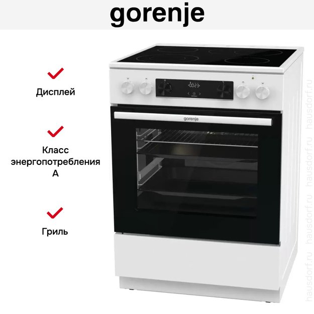 Электрическая плита Gorenje GEC6C60WA — отличный выбор как для квартиры, так и для частного дома. Цвет корпуса белый, он гармонично сочетается с мебелью и техникой похожих оттенков, а также может интересно выглядеть на контрасте с ними. Для управления используется удобная и понятная электронная система. Благодаря ей выбирать режимы приготовления и настраивать параметры температуры очень просто. Основная информация о процессе отображается на дисплее. Переключатели не только выполняют техническую функцию, но и поддерживают общий дизайн; тип элементов: поворотные.