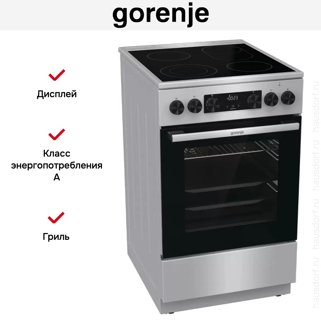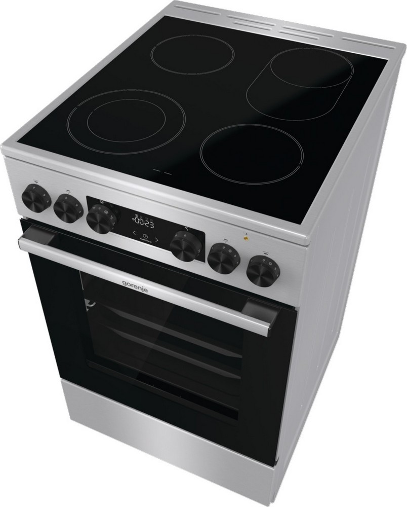 Электрическая плита Gorenje GECS5C70XA — отличный выбор как для квартиры, так и для частного дома. Цвет корпуса нержавеющая сталь, он гармонично сочетается с мебелью и техникой похожих оттенков, а также может интересно выглядеть на контрасте с ними. Для управления используется удобная и понятная электронная система. Благодаря ей выбирать режимы приготовления и настраивать параметры температуры очень просто. Основная информация о процессе отображается на дисплее. Переключатели не только выполняют техническую функцию, но и поддерживают общий дизайн; тип элементов: поворотные.