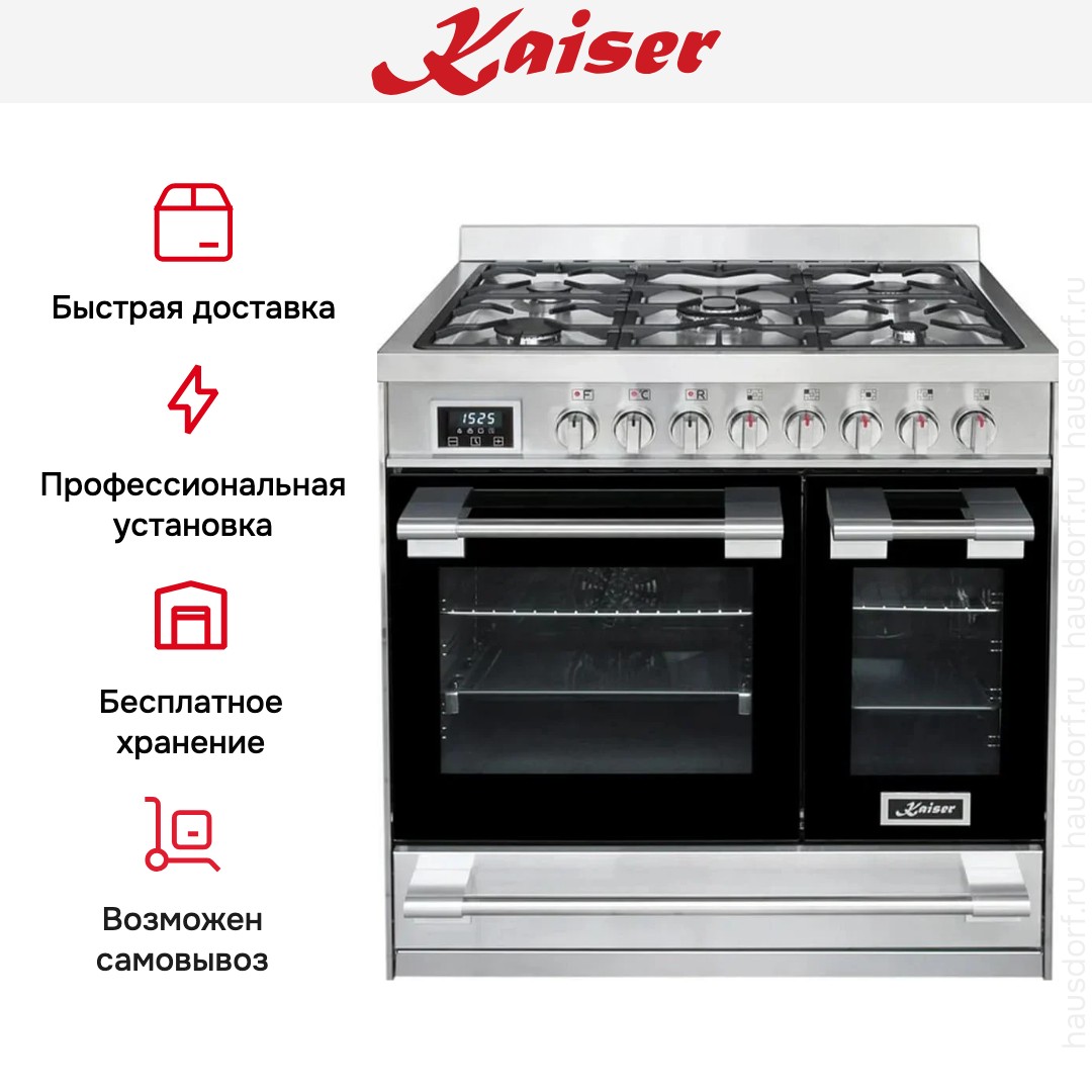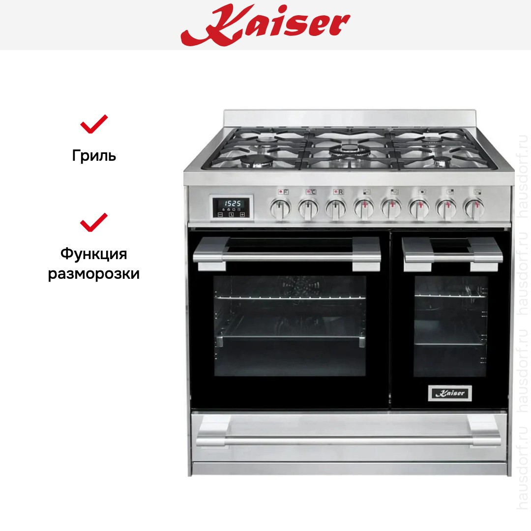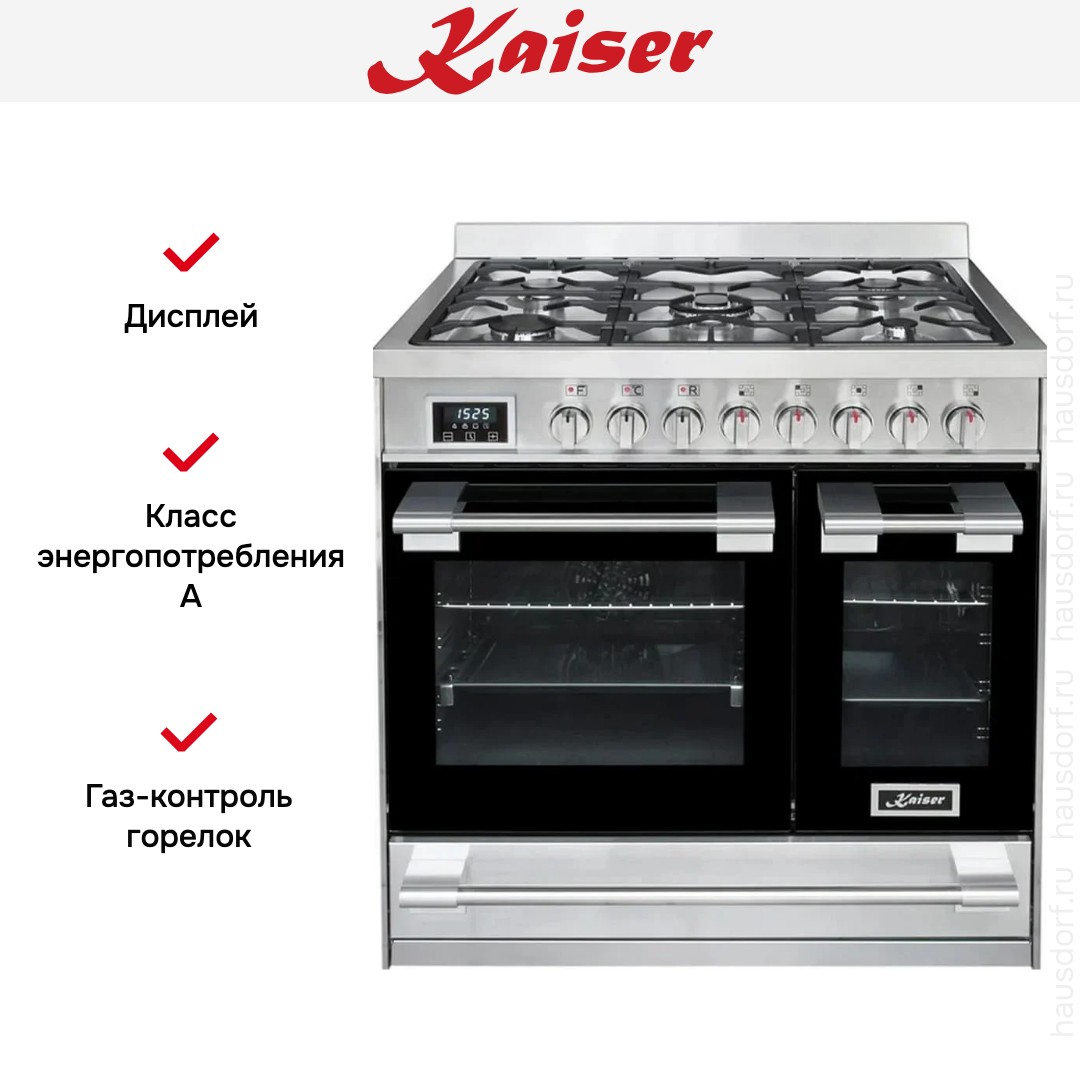 Комбинированная плита Kaiser HGE 93201 R — отличный выбор как для квартиры, так и для частного дома. Цвет корпуса нержавеющая сталь, он гармонично сочетается с мебелью и техникой похожих оттенков, а также может интересно выглядеть на контрасте с ними. На внутренней поверхности двери расположена таблица доступных рецептов — полезная и необычная фишка. Для управления используется удобная и понятная электронно-механическая система. Благодаря ей выбирать режимы приготовления и настраивать параметры температуры очень просто. Основная информация о процессе отображается на дисплее. Переключатели не только выполняют техническую функцию, но и поддерживают общий дизайн; тип элементов: сенсорные + поворотные.