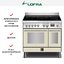 Устройства с тремя духовками также имеют один основной и две дополнительных шкафа разного объема: например, плиты Bertazzoni оснащены большой духовкой объемом 69 литров, средней объемом 54 литра и малой объемом 24 литра. Духовки располагаются в два ряда: две меньшие духовки в одном ряду, большая и ящик для посуды в другом.