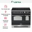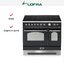 Устройства с тремя духовками также имеют один основной и две дополнительных шкафа разного объема: например, плиты Bertazzoni оснащены большой духовкой объемом 69 литров, средней объемом 54 литра и малой объемом 24 литра. Духовки располагаются в два ряда: две меньшие духовки в одном ряду, большая и ящик для посуды в другом.