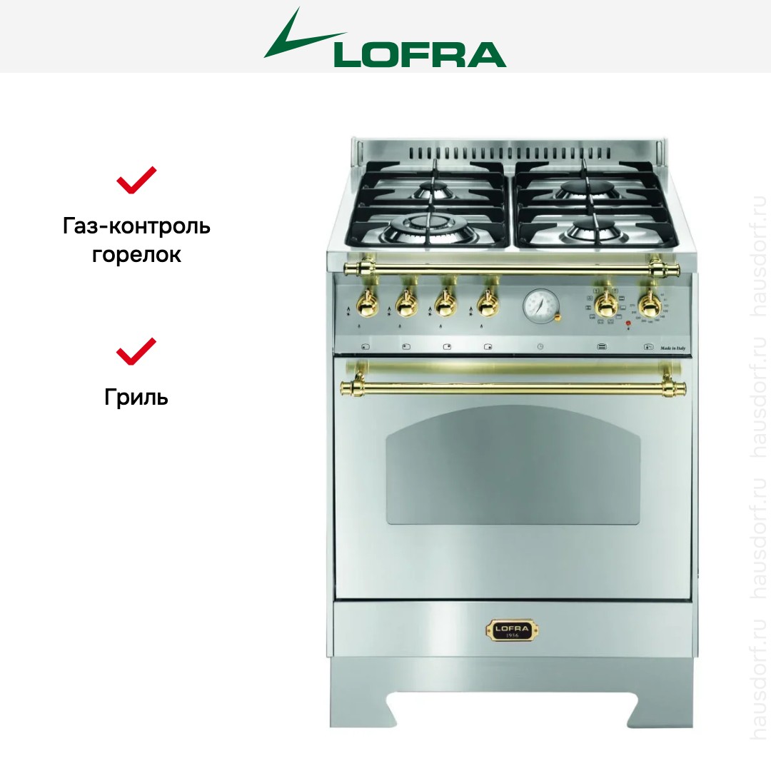 Комбинированная плита Lofra RS66MFT/Ci Brass — отличный выбор как для квартиры, так и для частного дома. Цвет корпуса нержавеющая сталь, он гармонично сочетается с мебелью и техникой похожих оттенков, а также может интересно выглядеть на контрасте с ними. Для управления используется удобная и понятная механическая система. Благодаря ей выбирать режимы приготовления и настраивать параметры температуры очень просто. Переключатели не только выполняют техническую функцию, но и поддерживают общий дизайн; тип элементов: поворотные.