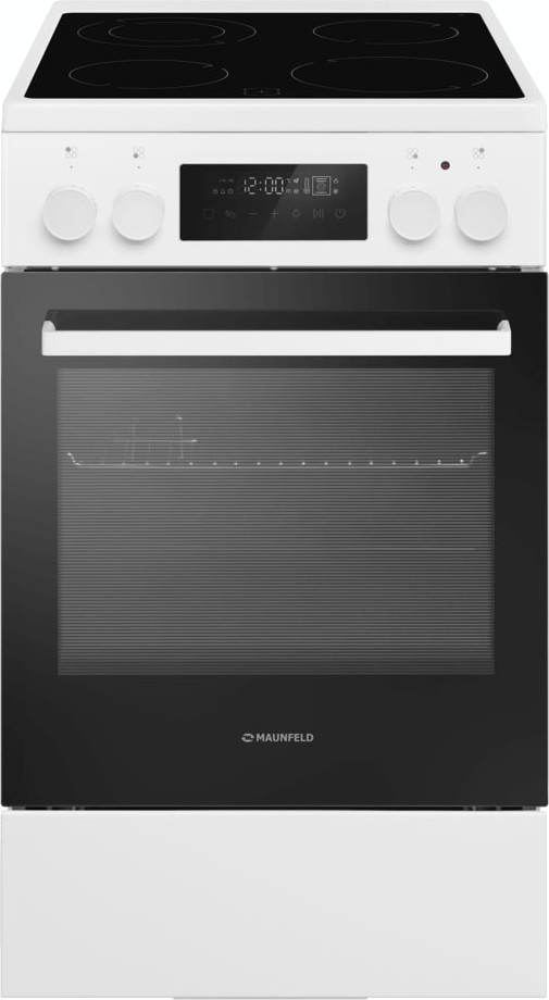 Электрическая плита Maunfeld MEC511CW09TD — отличный выбор как для квартиры, так и для частного дома. Цвет корпуса белый, он гармонично сочетается с мебелью и техникой похожих оттенков, а также может интересно выглядеть на контрасте с ними. На внутренней поверхности двери расположена таблица доступных рецептов — полезная и необычная фишка. Для управления используется удобная и понятная электронная система. Благодаря ей выбирать режимы приготовления и настраивать параметры температуры очень просто. Основная информация о процессе отображается на дисплее. Переключатели не только выполняют техническую функцию, но и поддерживают общий дизайн; тип элементов: сенсорные + поворотные.