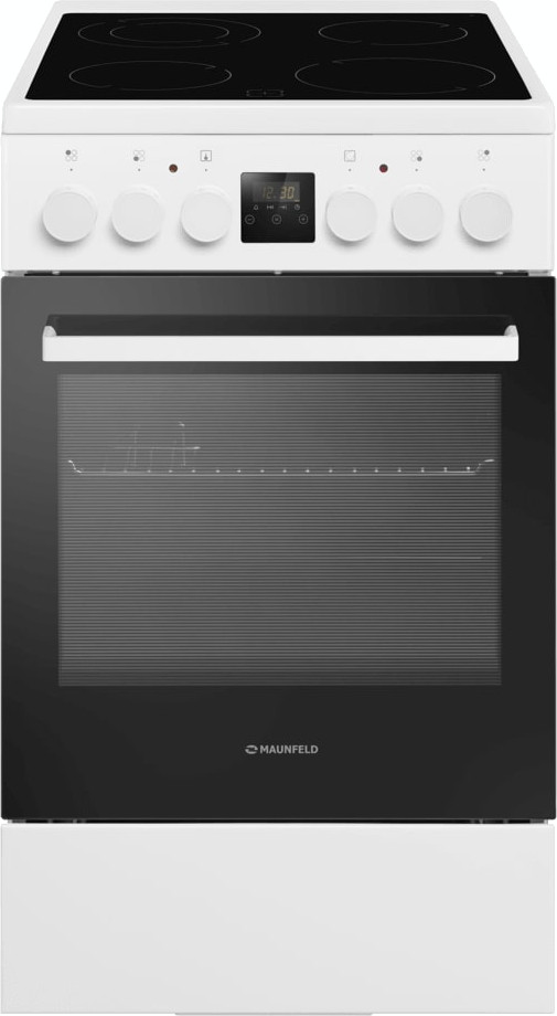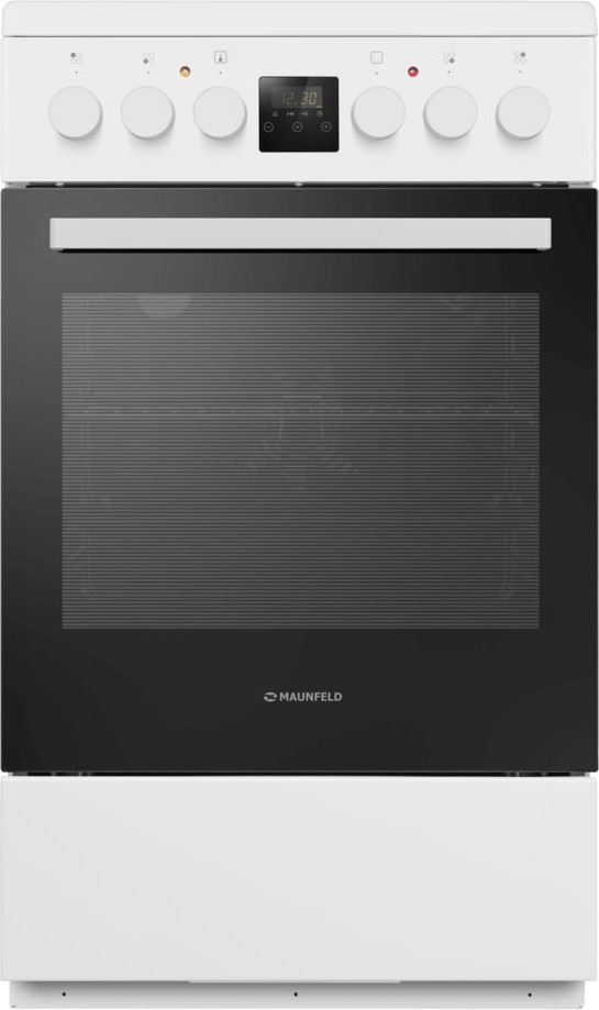 Электрическая плита Maunfeld MEC57CW08TD — отличный выбор как для квартиры, так и для частного дома. Цвет корпуса белый, он гармонично сочетается с мебелью и техникой похожих оттенков, а также может интересно выглядеть на контрасте с ними. На внутренней поверхности двери расположена таблица доступных рецептов — полезная и необычная фишка. Для управления используется удобная и понятная электронная система. Благодаря ей выбирать режимы приготовления и настраивать параметры температуры очень просто. Основная информация о процессе отображается на дисплее. Переключатели не только выполняют техническую функцию, но и поддерживают общий дизайн; тип элементов: сенсорные + поворотные.