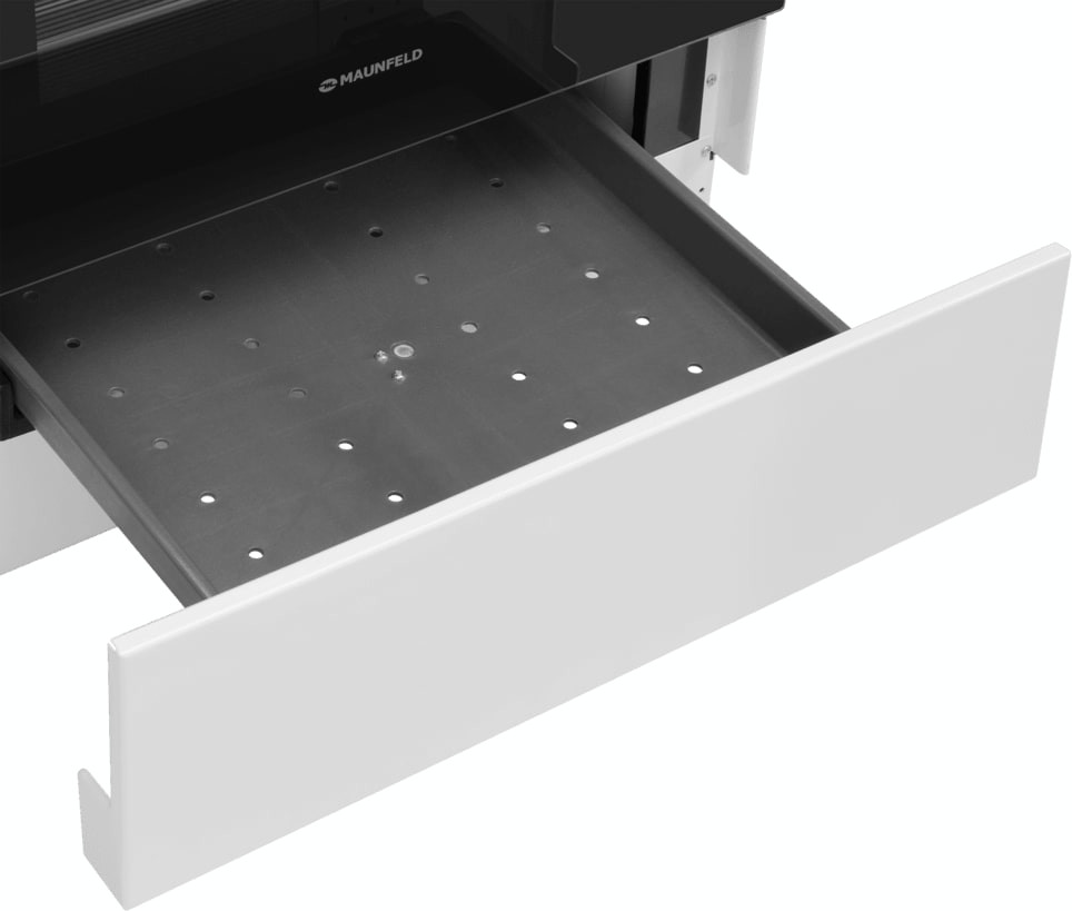 Внутренняя поверхность имеет специальное защитное покрытие: эмаль легкой очистки хорошо аккумулирует и держит тепло, не нуждается в специфическом уходе. Следуйте инструкции для удаления загрязнений — и прибор прослужит вам много лет без повреждений. Продуманная система направляющих для противней предупреждает падение тяжелой посуды при ее загрузке и извлечении: в этой модели используются хромированные элементы. Приятный бонус — специальное отделение для хранения посуды и аксессуаров.