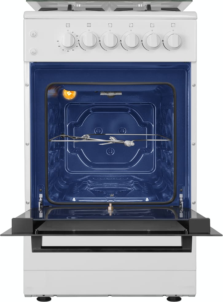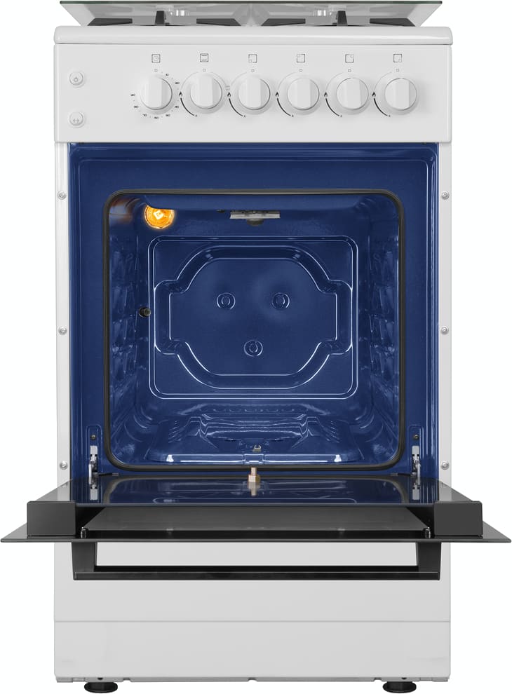 Внутренняя поверхность имеет специальное защитное покрытие: эмаль хорошо аккумулирует и держит тепло, не нуждается в специфическом уходе. Следуйте инструкции для удаления загрязнений — и прибор прослужит вам много лет без повреждений. Система электроподжига газовой духовки упрощает работу, а также защищает вас от высоких температур. Отдельный газ-контроль для камеры дополнительно гарантирует безопасность использования. Продуманная система направляющих для противней предупреждает падение тяжелой посуды при ее загрузке и извлечении: в этой модели используются рельефные элементы. Приятный бонус — специальное отделение для хранения посуды и аксессуаров.
