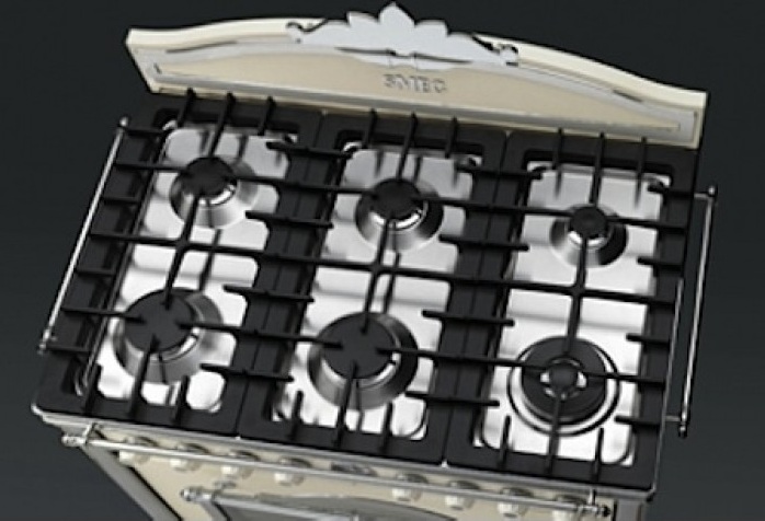 Гораздо разнообразнее представлена фурнитура в моделях в классическом, средиземноморском, деревенском или ретро-дизайне. Так, модели производства Lofra оснащаются фигурными рейлингами и поворотными переключателями цвета латуни, состаренного серебра, хрома, золота. В варочных центрах La Cornue интерес представляет круглая накладная ручка дверцы духовки серебристого цвета. Фурнитурой в стиле ретро оснащаются варочные центры производства Smeg, Kaiser, Bertazzoni, но особенно разнообразны и оригинальны модели производства итальянской компании Restart с фурнитурой из меди и латуни. Каждая такая модель изготавливается по индивидуальному проекту, и покупатель может выбрать цвет и форму переключателей, дверцы и ручек духовых шкафов и другие элементы дизайна.