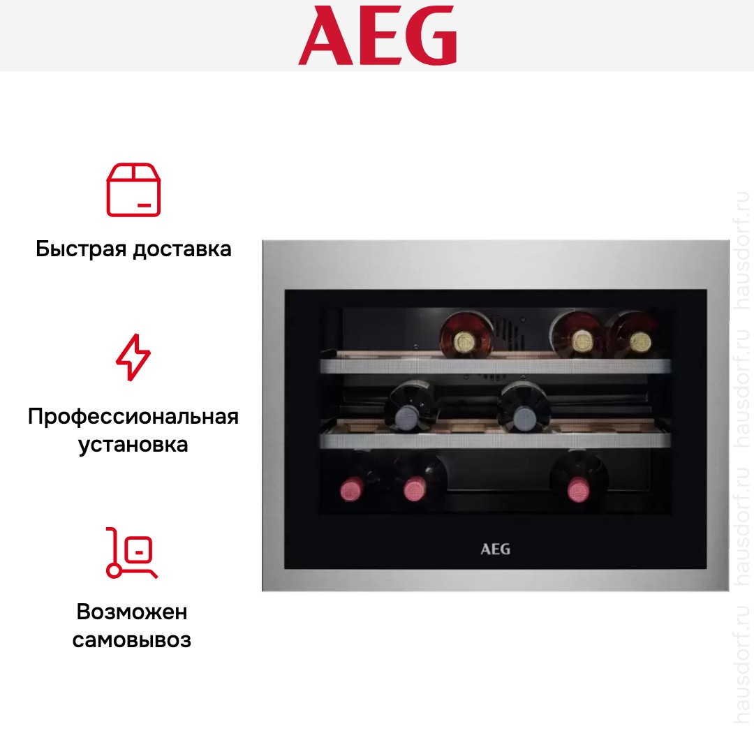 Винный шкаф AEG KWE884520M — компактная встраиваемая модель (шириной 59, 5 см и высотой 40 см) серии Wine Cellar стального цвета с фронтоном черного оттенка. Сенсорная панель управления с электронным дисплеем, показывающим выбранный режим работы устройства, находится над камерой хранения.
