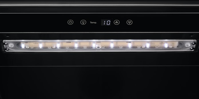 Кнопки для управления подсветкой выносятся на панель управления. Лампы синего, белого или голубого цветов могут располагаться в верхней части камеры или на боковых сторонах. Дополнительное освещение может устанавливаться в винных холодильниках с зоной для сервировки: она обеспечивает лучший обзор и доступ при подготовке вина к подаче.