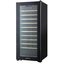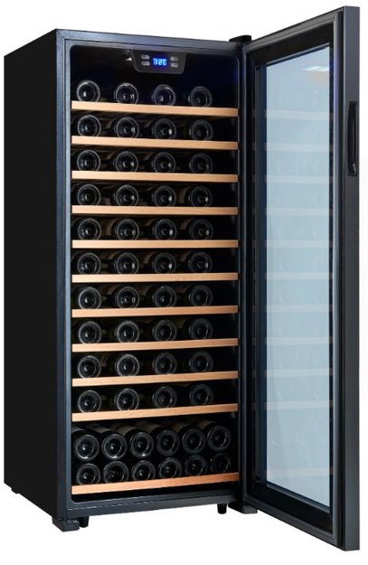 Стеклянная дверь — дополнительный изящный штрих к общему дизайну модели. Специальное покрытие защищает вино от влияния ультрафиолетовых лучей, которые проникают, если шкаф находится в солнечной комнате. Цвет корпуса — черный.