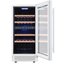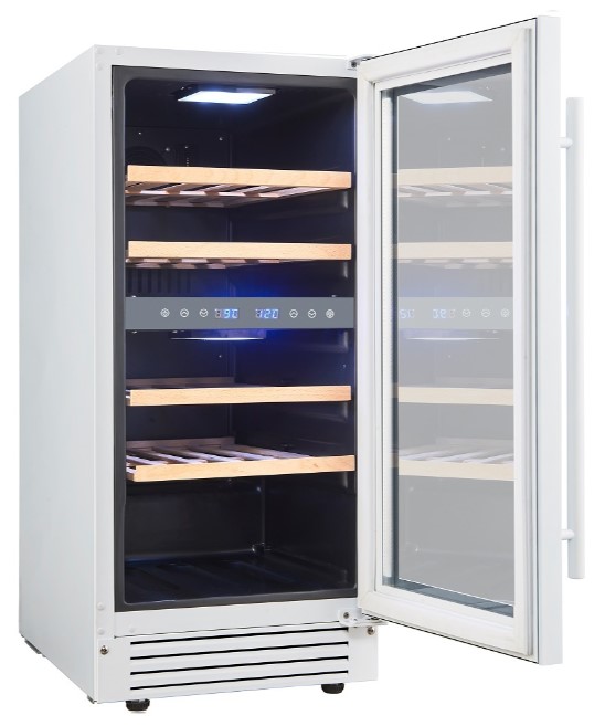 Стеклянная дверь — дополнительный изящный штрих к общему дизайну модели. Специальное покрытие защищает вино от влияния ультрафиолетовых лучей, которые проникают, если шкаф находится в солнечной комнате. Цвет корпуса — белый. Дверь можно перевесить на другую сторону, поэтому вариантов размещения его в доме становится больше.