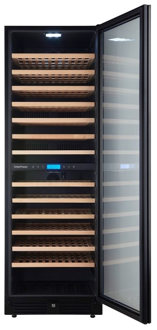 Электронное управление помогает быстро разобраться в том, как функционирует эта модель, и легко настроить все необходимые параметры. На дисплее отображаются данные, которые собирают датчики в камере. Лампочки, расположенные внутри, хорошо подсвечивают бутылки. Всего полок, на которых можно разместить коллекцию, в шкафу 13 шт. Пространство тщательно вентилируется, чтобы воздух не застаивался, не попадали посторонние запахи.