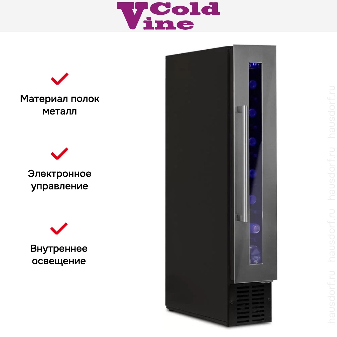 Винный холодильник Cold Vine C7-KST1 имеет одну температурную зону, в которой можно разместить бутылки и единовременно выставить только одну комбинацию настроек. Он устанавливается отдельно, что удобно, если у вас есть специальное помещение — кладовая, погреб и т.д. Благодаря компактным размерам данная модель — отличный выбор для офиса, гостиничного номера. Количество бутылок, которое можно разместить с учетом полной комплектации и из расчета объема бутылки 0,75 л, — 7 шт.