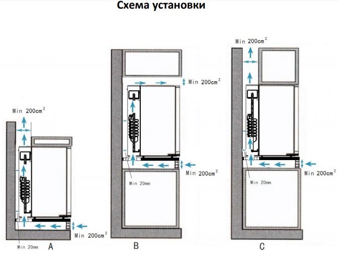 Частичное встраивание отдельно стоящих винных шкафов в нишу — полезная опция, позволяющая сэкономить место в помещении и выбрать лучшее расположение прибора. Устанавливать в нишу или под столешницу рекомендуется только компрессорные модели — другие, например, термоэлектрические, не смогут достаточно вентилироваться при таком расположении. Если винный холодильник оснащен воздухозаборными решетками и радиатором охлаждения в нижней части, он может быть встроен без зазоров. Для удаления нагретого воздуха требуется свободный проход по всей длине холодильника от цоколя до верхней части.
