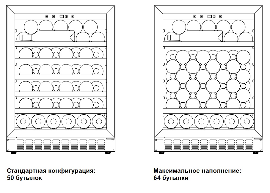 Стандартная вместительность рассчитывается по количеству бутылок «Бордо» 0,75 л. Это число также показывает максимальную загрузку при полной комплектации (полок, ящиков и других элементов).