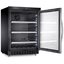 Встраиваемые холодильники для вина оснащаются специальной системой вентиляции: охлаждающая система у них находится в нижней части корпуса спереди. На такие устройства не навешивается мебельный фасад: дверца с затемненным стеклом остается на виду и открывается на достаточно широкий угол для свободного выдвижения деревянных полок.