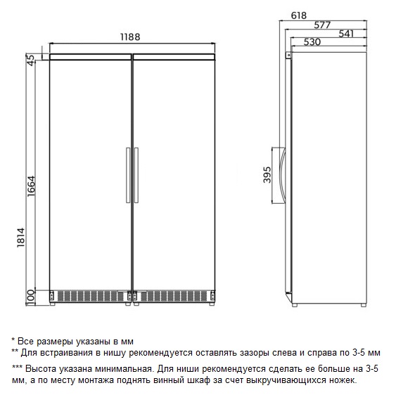 Высота встраиваемых винных шкафов может варьироваться примерно в таком же диапазоне. Стандартные размеры встраиваемых винных шкафов должна соответствовать габаритам мебели, так что высота их может быть несколько меньше, чем у отдельно стоящих моделей.