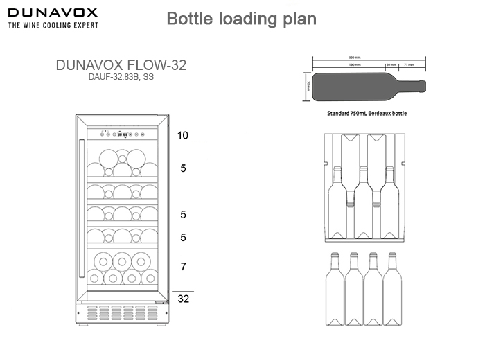 Стандартная вместительность рассчитывается по количеству бутылок «Бордо» 0,75 л. Это число также показывает максимальную загрузку при полной комплектации (полок, ящиков и других элементов).