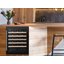 Встраиваемые холодильники для вина оснащаются специальной системой вентиляции: охлаждающая система у них находится в нижней части корпуса спереди. На такие устройства не навешивается мебельный фасад: дверца с затемненным стеклом остается на виду и открывается на достаточно широкий угол для свободного выдвижения деревянных полок.