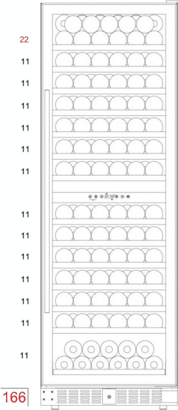 Стандартная вместительность рассчитывается по количеству бутылок «Бордо» 0,75 л. Это число также показывает максимальную загрузку при полной комплектации (полок, ящиков и других элементов).