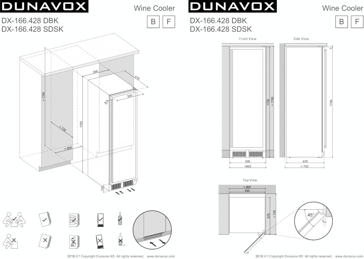 Винный холодильник Dunavox DX-166.428DCK имеет две температурные зоны, в которых одновременно можно хранить разные сорта алкоголя и выставлять разные сочетания настроек. Он устанавливается отдельно, что удобно, если у вас есть специальное помещение — кладовая, погреб и т.д. Количество бутылок, которое можно разместить с учетом полной комплектации и из расчета объема бутылки 0,75 л, — 166 шт.