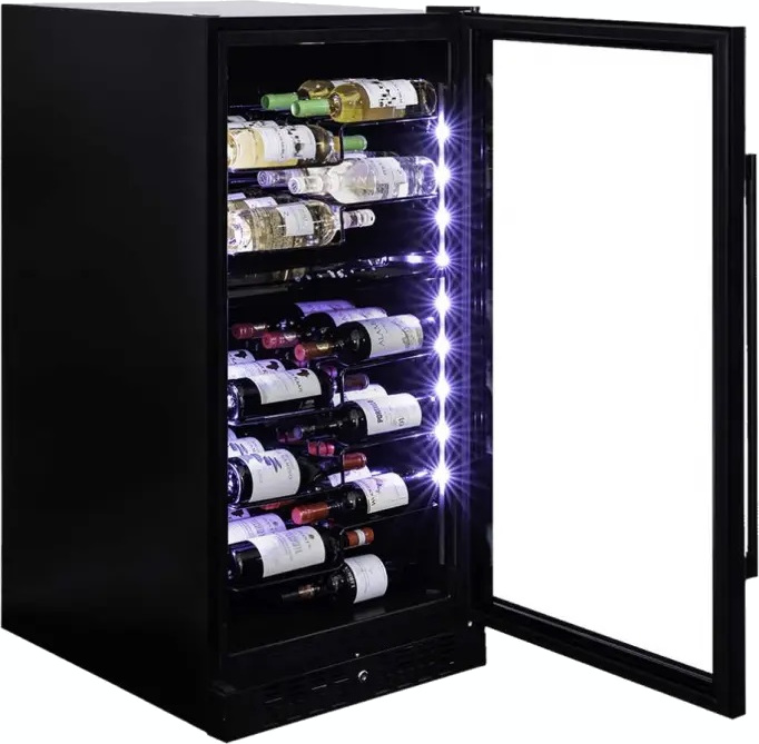 Кнопки для управления подсветкой выносятся на панель управления. Лампы синего, белого или голубого цветов могут располагаться в верхней части камеры или на боковых сторонах. Дополнительное освещение может устанавливаться в винных холодильниках с зоной для сервировки: она обеспечивает лучший обзор и доступ при подготовке вина к подаче.