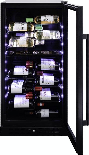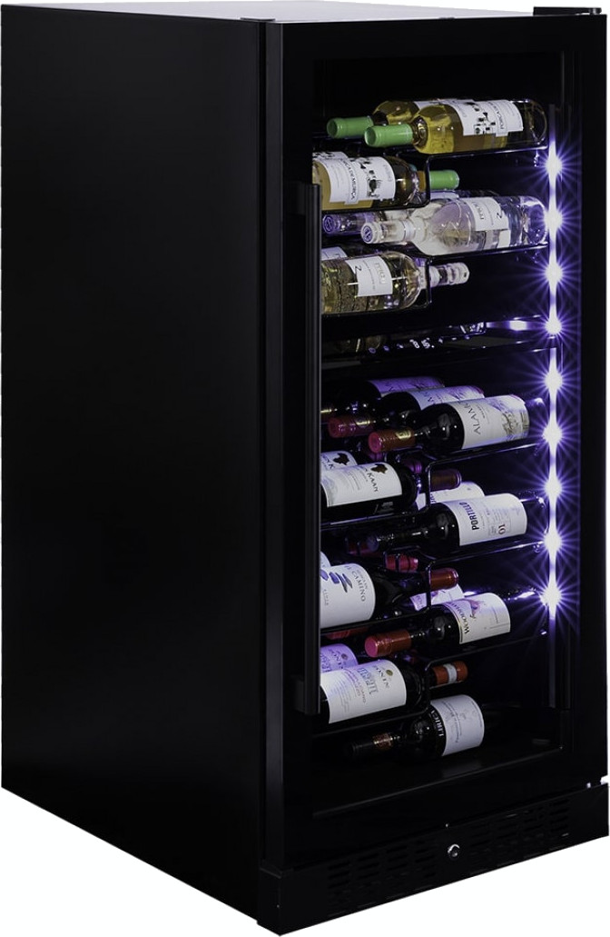 Специальное покрытие защищает вино от влияния ультрафиолетовых лучей, которые проникают, если шкаф находится в солнечной комнате. Хранение становится еще безопаснее и герметичнее благодаря нескольким слоям стекол. Цвет корпуса — черный матовый. Дверь можно перевесить на другую сторону, поэтому вариантов размещения его в доме становится больше.