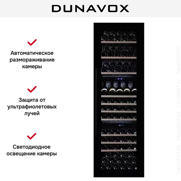 Светодиодное освещение камеры винного шкафа Dunavox позволяет не только беспрепятственно осматривать коллекцию, но и ярко подчеркнуть ее внешний вид. С использованием подсветки холодильник станет яркой частью дизайна, а LED лампы помогут экономить электроэнергию и прослужат долгие годы.