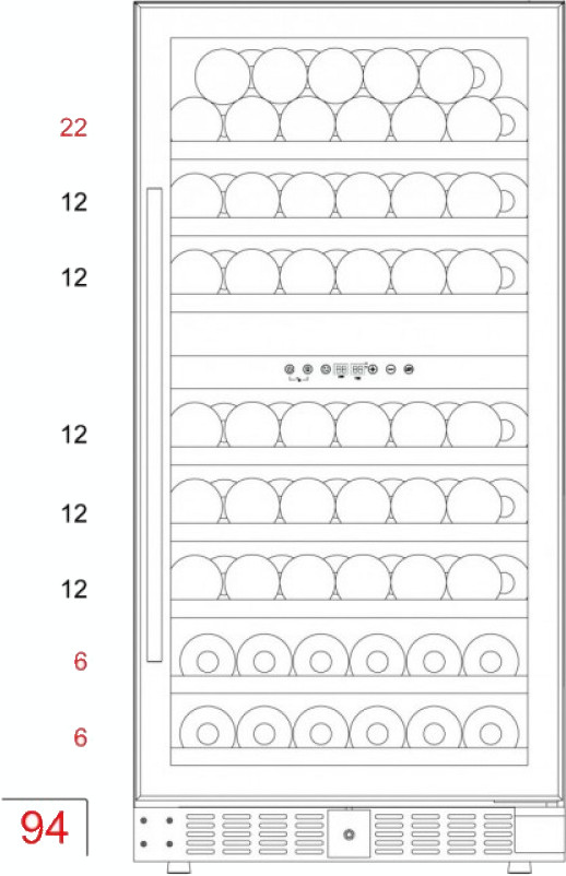 Стандартная вместительность рассчитывается по количеству бутылок «Бордо» 0,75 л. Это число также показывает максимальную загрузку при полной комплектации (полок, ящиков и других элементов).