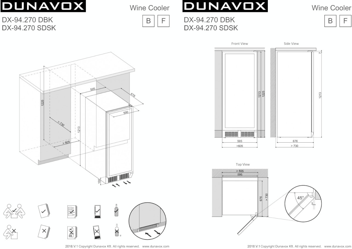 Винный холодильник Dunavox DX-94.270DCK имеет две температурные зоны, в которых одновременно можно хранить разные сорта алкоголя и выставлять разные сочетания настроек. Он устанавливается отдельно, что удобно, если у вас есть специальное помещение — кладовая, погреб и т.д. Количество бутылок, которое можно разместить с учетом полной комплектации и из расчета объема бутылки 0,75 л, — 94 шт.