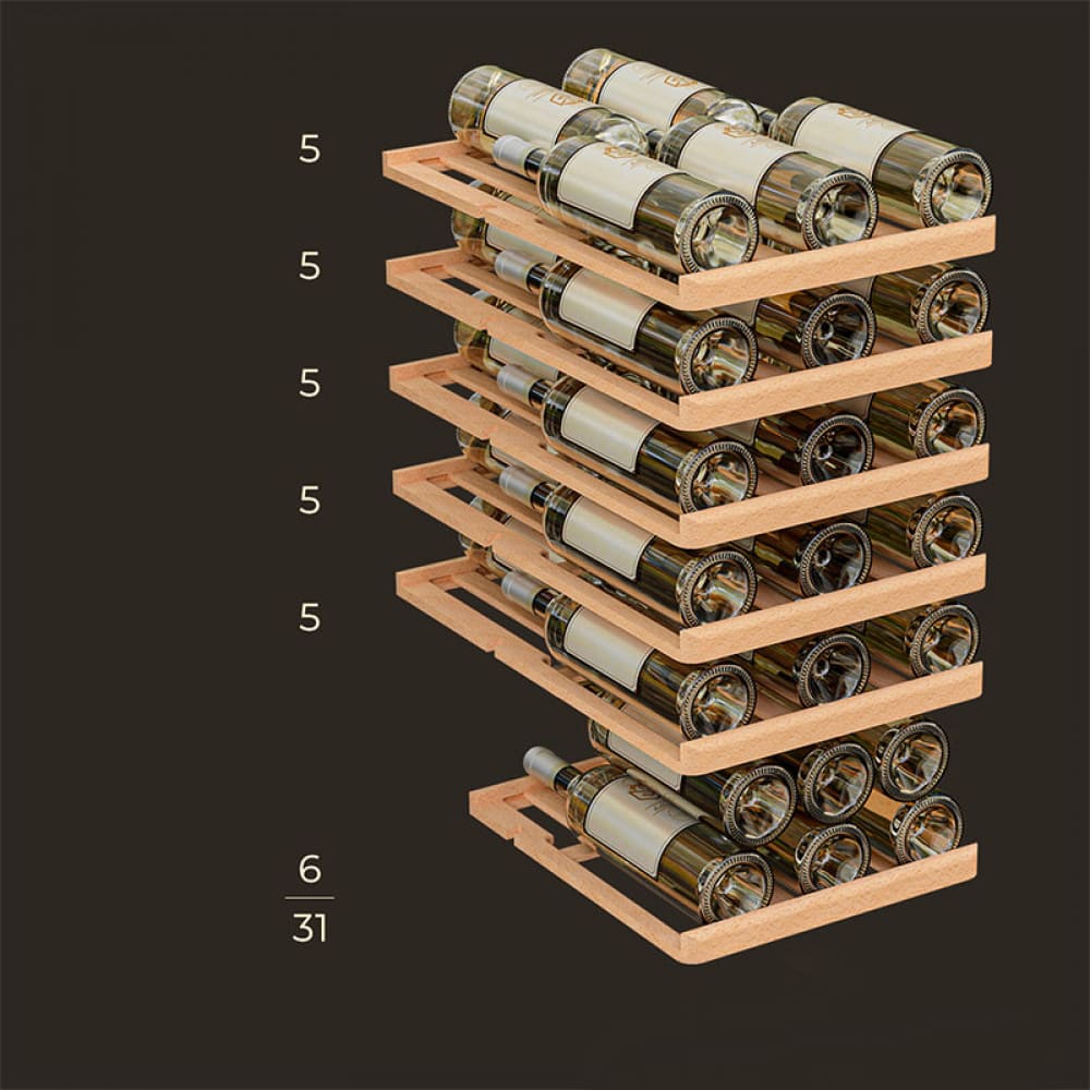 Полки в винных шкафах позволяют размещать бутылки для хранения в горизонтальном положении. Это необходимо, чтобы пробка постоянно смачивалась жидкостью и не пересыхала. Плотно закрытая пробка гарантирует, что внутрь бутылки не проникнет наружный воздух. Кислород, содержащийся в воздухе, может стать причиной ухудшения вкуса вина и даже его скисания. Кроме того, горизонтальное положение позволяет лучше оценить количество осадка. Материал изготовления полок выбирается, исходя из требований, предъявляемых к содержанию коллекции вин. Одним из основных требования является отсутствие или максимальное сокращение вибрации и хорошая фиксация бутылок на месте хранения. Даже если полка выдвигается, бутылки должны оставаться на своем месте. Второе требование исключает применение стеклянных полок, как в обычном холодильнике: на них почти невозможно зафиксировать бутылки.