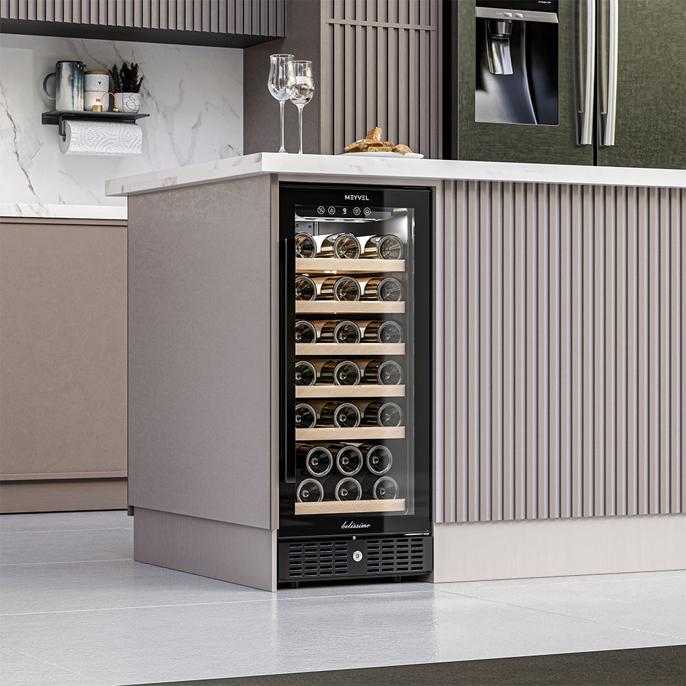 Частичное встраивание отдельно стоящих винных шкафов в нишу — полезная опция, позволяющая сэкономить место в помещении и выбрать лучшее расположение прибора. Устанавливать в нишу или под столешницу рекомендуется только компрессорные модели — другие, например, термоэлектрические, не смогут достаточно вентилироваться при таком расположении. Если винный холодильник оснащен воздухозаборными решетками и радиатором охлаждения в нижней части, он может быть встроен без зазоров. Для удаления нагретого воздуха требуется свободный проход по всей длине холодильника от цоколя до верхней части.