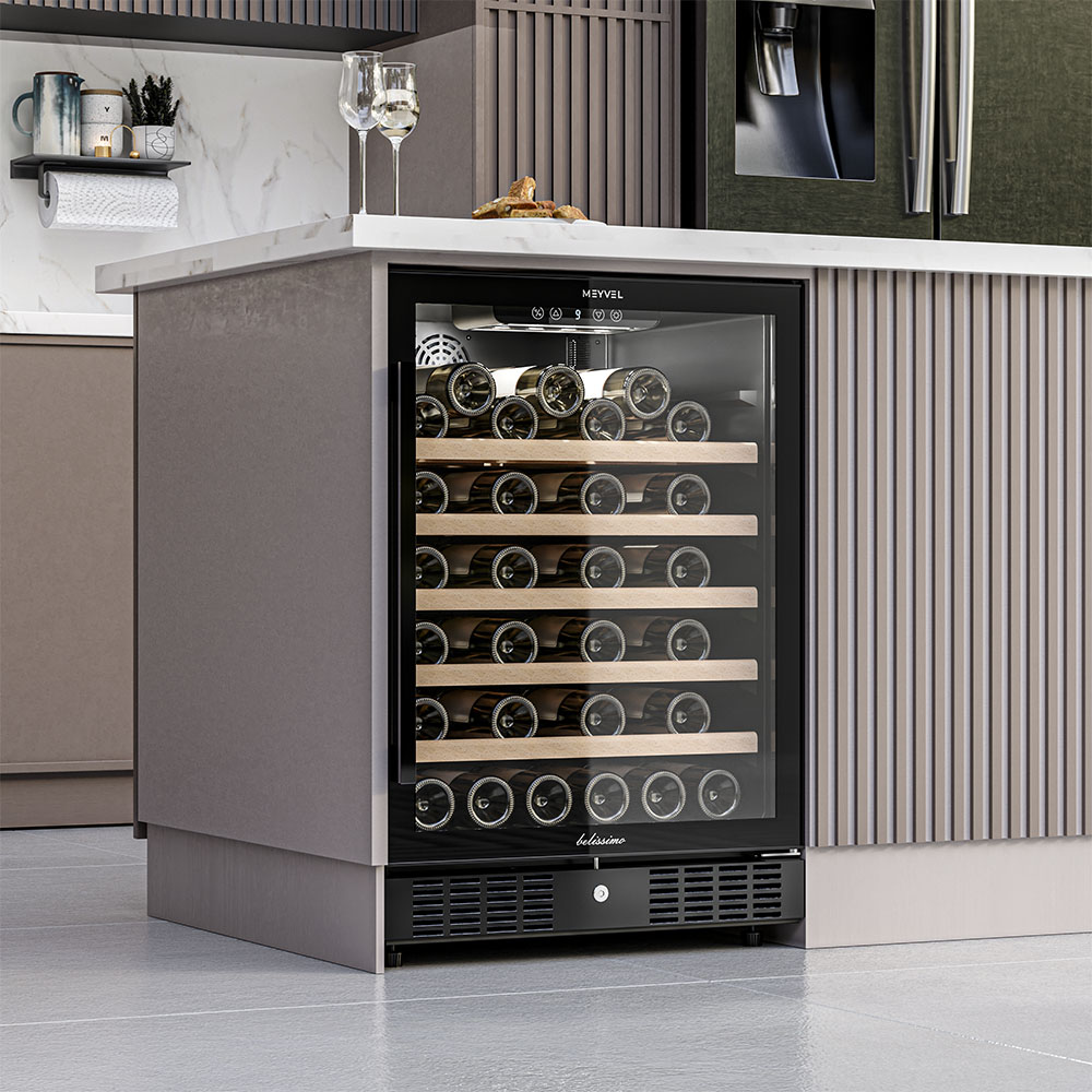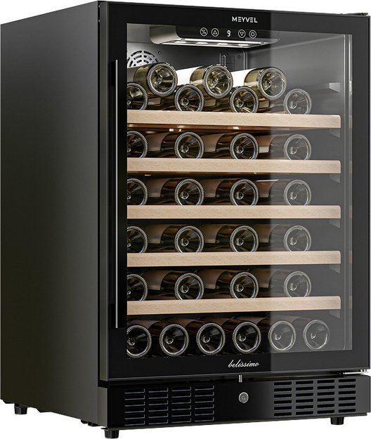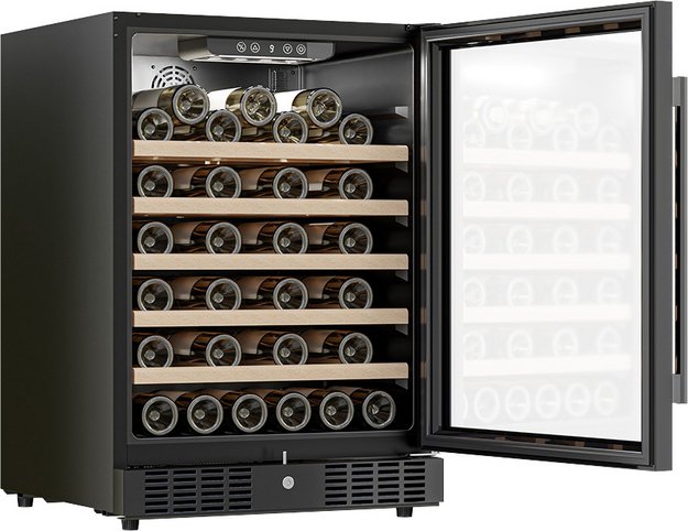 Винный холодильник Meyvel MV52-KBT1 имеет одну температурную зону, в которой можно разместить бутылки и единовременно выставить только одну комбинацию настроек. Он устанавливается отдельно, что удобно, если у вас есть специальное помещение — кладовая, погреб и т.д. Благодаря компактным размерам данная модель — отличный выбор для офиса, гостиничного номера. Количество бутылок, которое можно разместить с учетом полной комплектации и из расчета объема бутылки 0,75 л, — 52 шт.