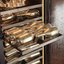 Встраиваемые холодильники для вина оснащаются специальной системой вентиляции: охлаждающая система у них находится в нижней части корпуса спереди. На такие устройства не навешивается мебельный фасад: дверца с затемненным стеклом остается на виду и открывается на достаточно широкий угол для свободного выдвижения деревянных полок.