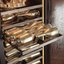 Встраиваемые холодильники для вина оснащаются специальной системой вентиляции: охлаждающая система у них находится в нижней части корпуса спереди. На такие устройства не навешивается мебельный фасад: дверца с затемненным стеклом остается на виду и открывается на достаточно широкий угол для свободного выдвижения деревянных полок.