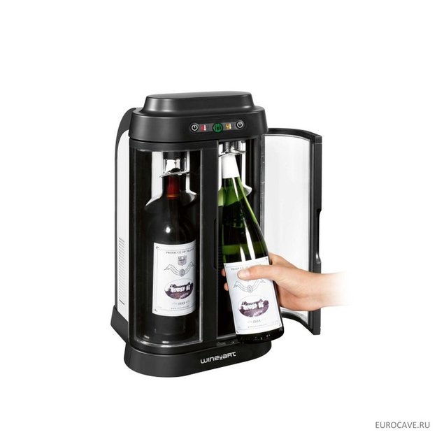 Процесс использования прибора очень прост, уже открытую бутылку вы устанавливаете в отсек, специальная система удаляет из нее воздух, в таком состоянии она может храниться до 10 дней, и вино не потеряет своих вкусовых качеств.
