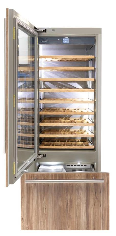 Винный холодильник Fhiaba S750TWT3 имеет две температурные зоны, в которых одновременно можно хранить разные сорта алкоголя и выставлять разные сочетания настроек. Он встраивается в нишу, что удобно, если у вас ограничен метраж помещения. Количество бутылок, которое можно разместить с учетом полной комплектации и из расчета объема бутылки 0,75 л, — 81 шт.