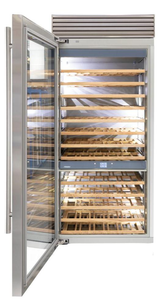 Ширина винного шкафа, как и другие их габариты, обязательно учитывается при выборе модели для домашнего или профессионального использования. Встраиваемые и отдельно стоящие модели выпускаются в самом широком ассортименте, так что разброс значений максимально велик. Неизменным спросом пользуются винные шкафы стандартной ширины — от 40 до 80 см, в современном и классическом стиле. Для встраиваемых шкафов наиболее удобной является ширина 60 см, позволяющая устанавливать их в кухонную тумбу или колонну. Вместимость их может быть самой различной и зависит в большей степени от высоты прибора. Маленькие винные шкафы с размещением на столешнице или даже с креплением к стене, рассчитанные на хранение от одной до десяти бутылок, могут иметь минимальную ширину от 13 см. На полках у них обычно помещается не более 5 бутылок, и используются они для охлаждения вина перед подачей. Большие винные шкафы с несколькими камерами и температурными зонами для длительного хранения и созревания разных сортов вина могут иметь ширину до 180 см, а максимальное значение этого параметра может составить 300 см. Как правило, это отдельно стоящие модели в деревянном корпусе с камерами side-by-side.