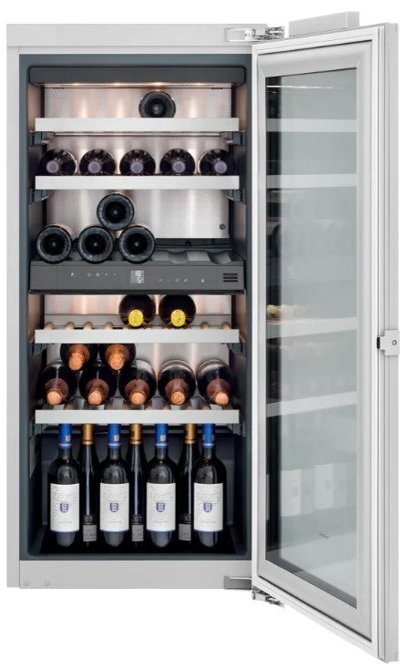 Винный холодильник Gaggenau RW222262 имеет две температурные зоны, в которых одновременно можно хранить разные сорта алкоголя и выставлять разные сочетания настроек. Он встраивается в нишу, что удобно, если у вас ограничен метраж помещения. Количество бутылок, которое можно разместить с учетом полной комплектации и из расчета объема бутылки 0,75 л, — 48 шт.