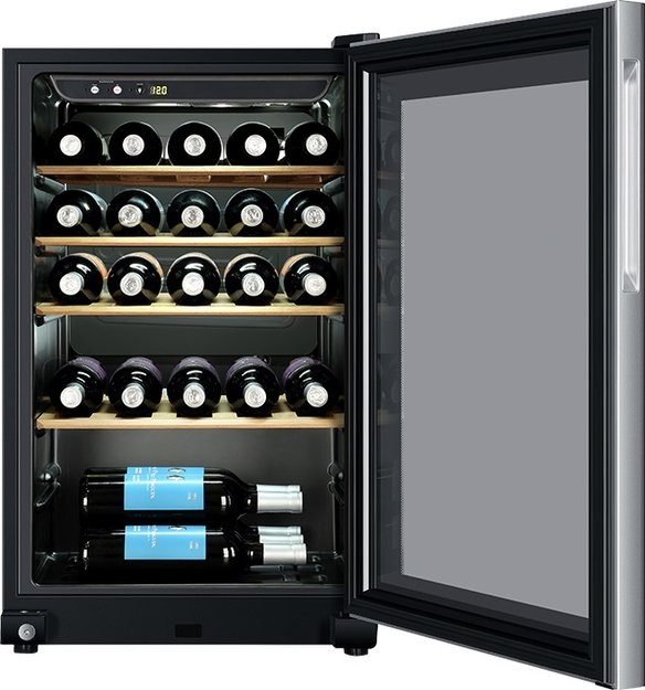 Винный шкаф вмещает до 30 бутылок на 4 деревянных полках (на дне холодильника можно положить 6 штук друг на друга). Температура регулируется в диапазоне от +6 до +18 градусов: есть автоматические настройки для красного и белого вина (отдельные кнопки на панели управления) и возможность выбрать уровень самостоятельно. Будьте уверены: ваша коллекция будет идеально подготовлена к подаче и не потеряет вкус и аромат в течение всего хранения.