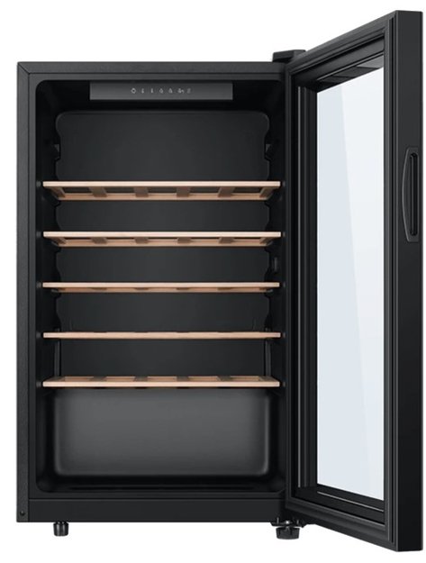 Стеклянная дверь — дополнительный изящный штрих к общему дизайну модели. Специальное покрытие защищает вино от влияния ультрафиолетовых лучей, которые проникают, если шкаф находится в солнечной комнате. Цвет корпуса — черный.