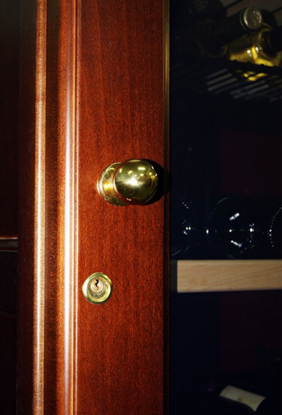 Реже выпускаются винные шкафы со сплошными дверцами из металла или дерева. «Глухая» дверь гарантирует гораздо лучшую сохранность коллекции, поскольку попадание солнечных лучей совершенно исключается. Кроме того, сплошная дверь способствует созданию единого стиля интерьера. Недостатком ее является та же непрозрачность: чтобы продемонстрировать коллекцию или отыскать ту или иную бутылку, дверцу приходится открыть.